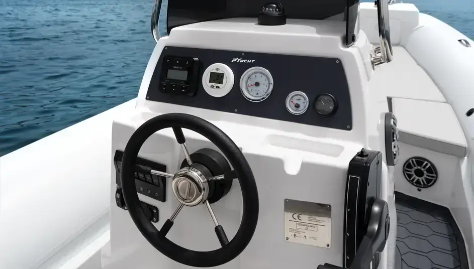 Autoclave completa, Bitte n.4, Bussola alta velocità, Cuscineria personalizzabile, Doccia esterna a poppa, Impianto elettrico, Indicatore livello carburante, Luci di fonda a 360°, Luci di navigazione, Pannello interruttori, Parabrezza in plexiglass, Pompa di sentina a immersione, Scaletta risalita, Staccabatteria, Tavolo di prua convertibile a prendisole, Tromba a incasso, Volante.